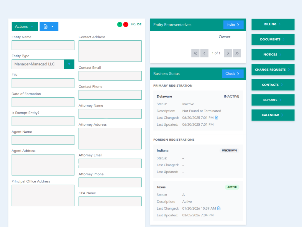 Staying compliant shouldn’t mean constant stress. Our real-time compliance monitoring gives you instant visibility into your entity status and filing requirements. We integrate directly with state systems to provide updates and reminders — ensuring nothing slips through the cracks.