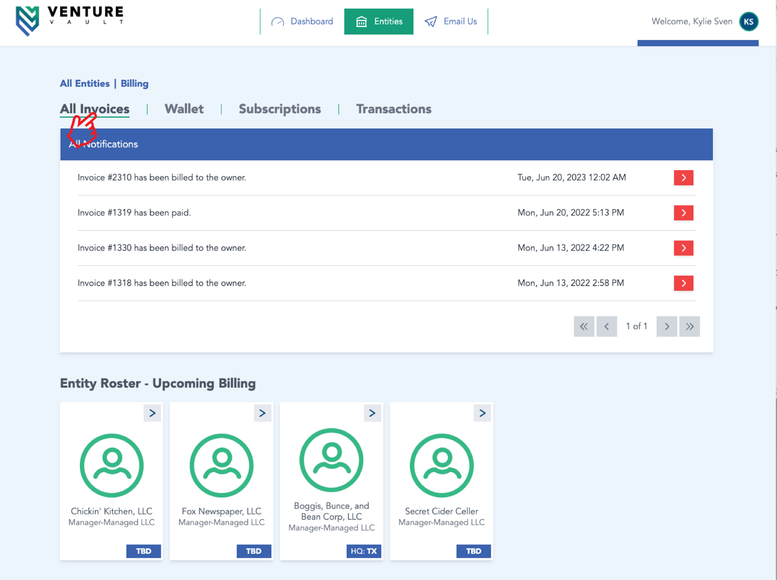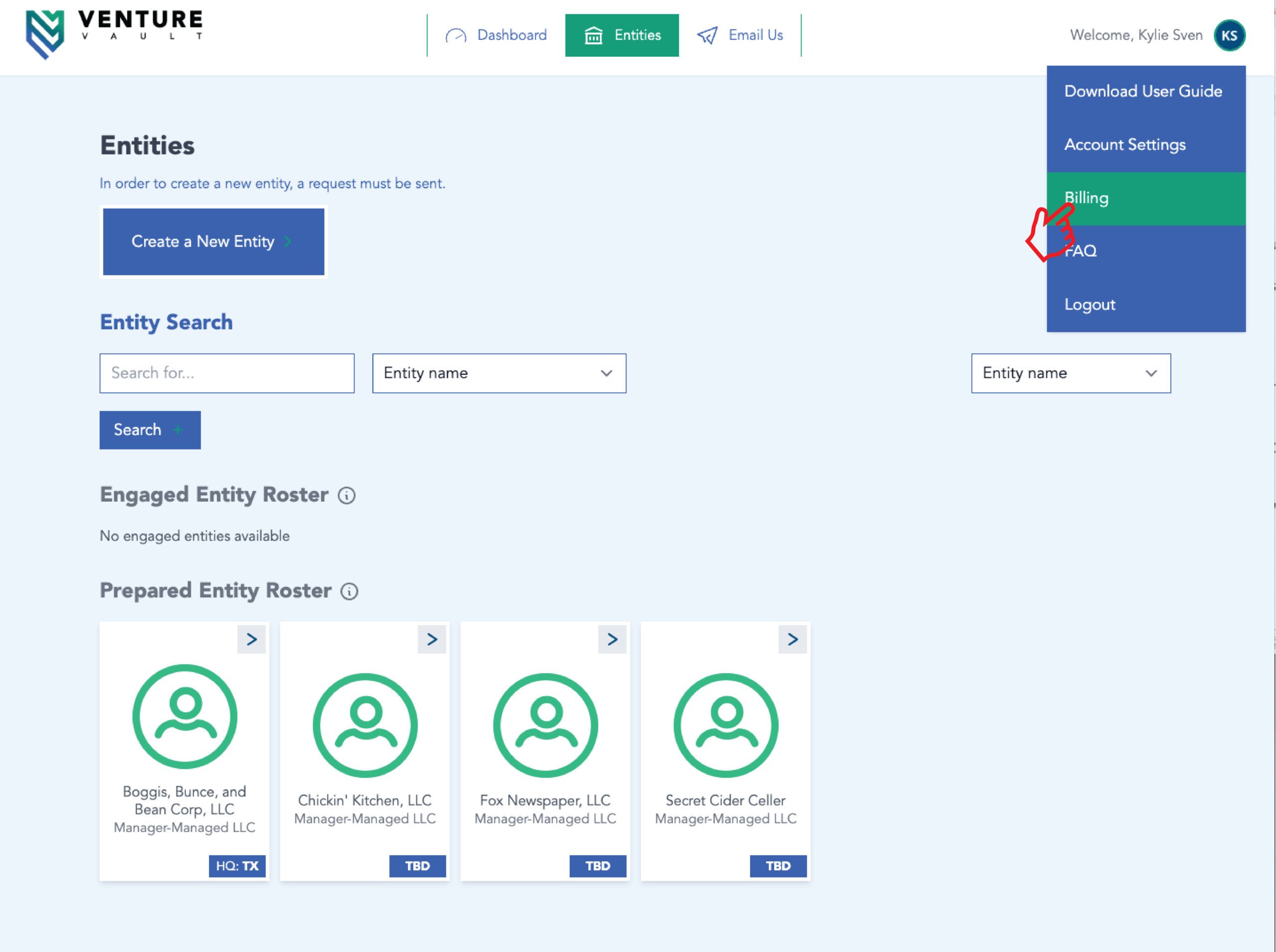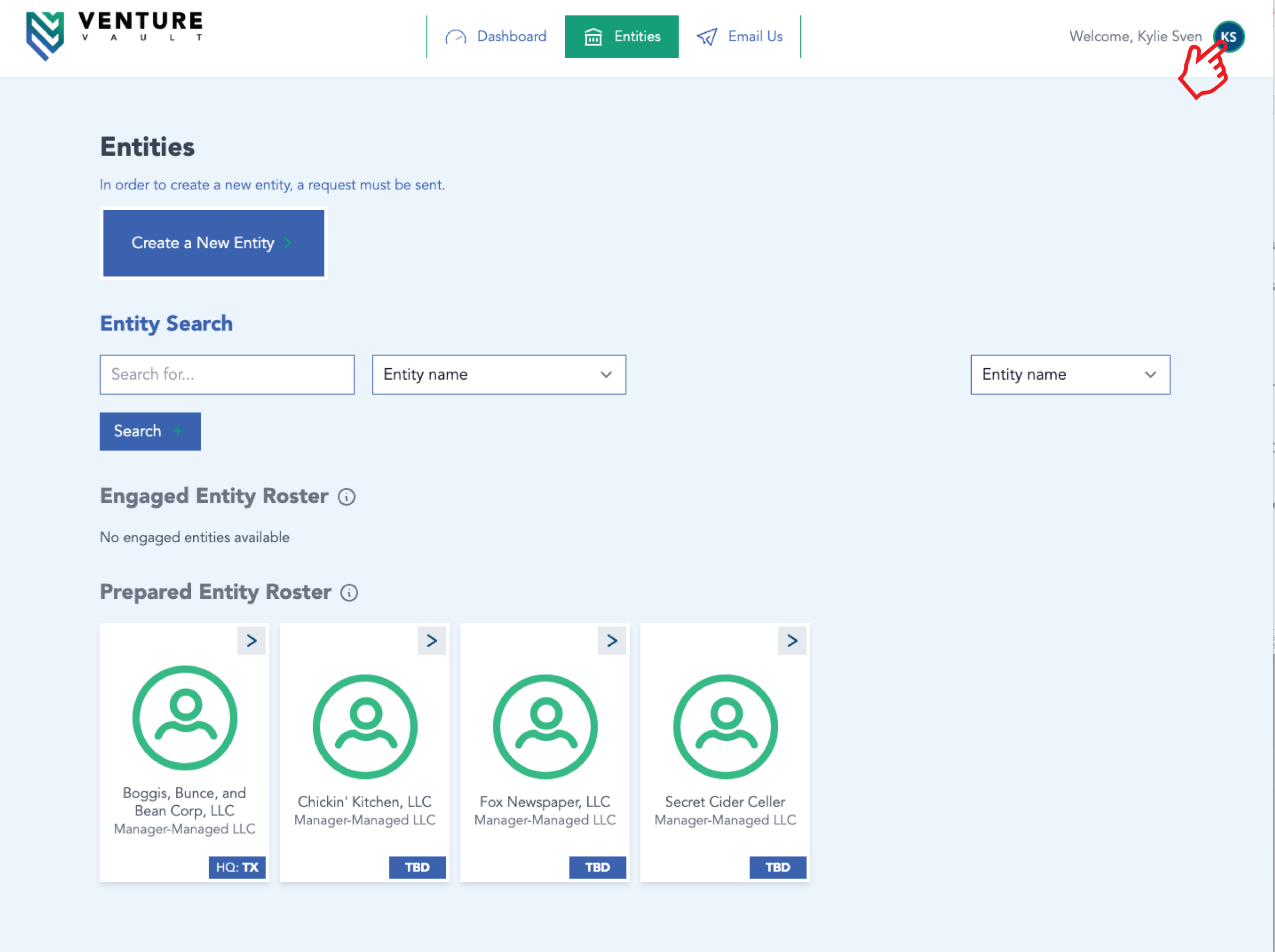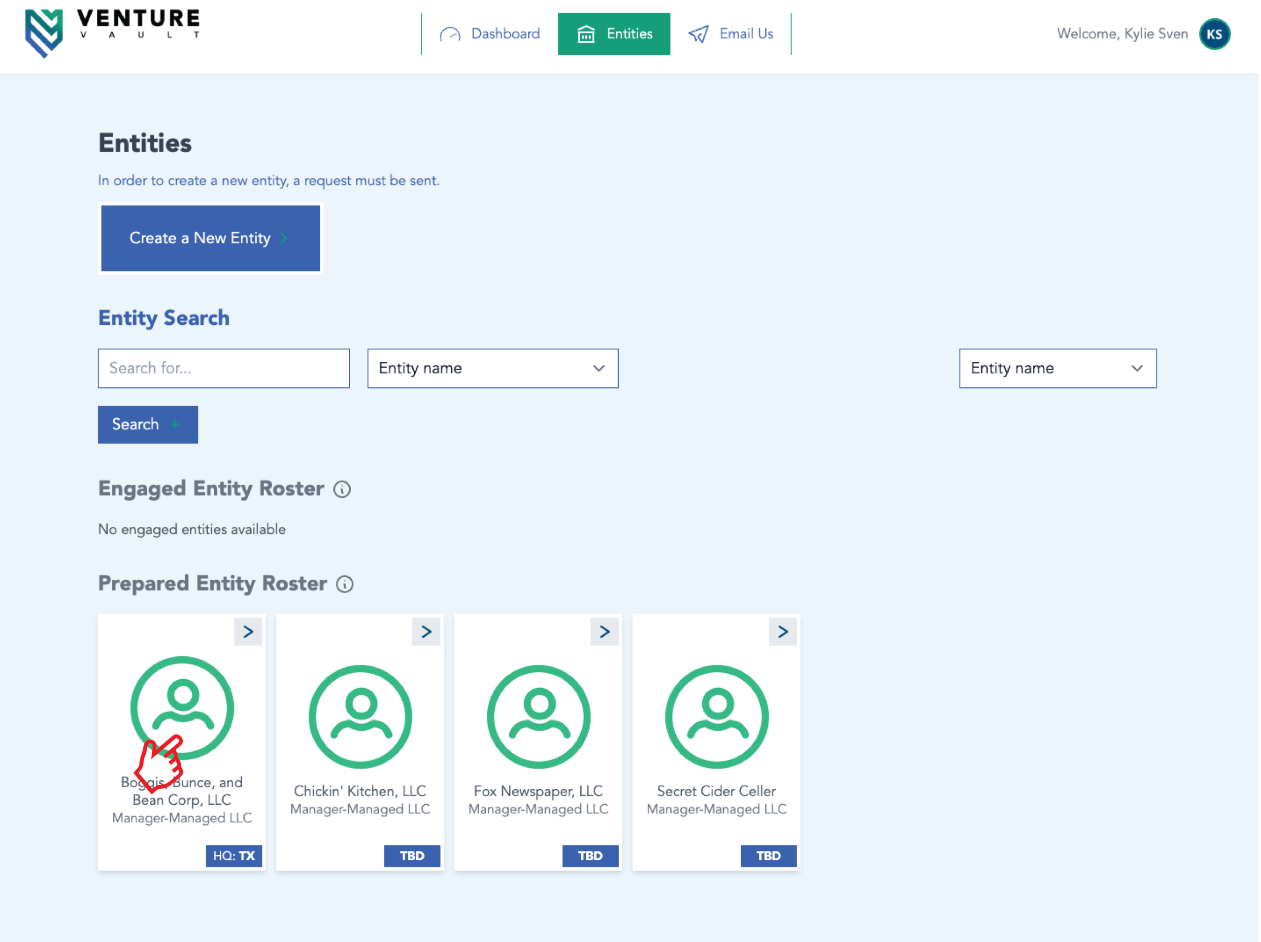 - Select the entity you’d like to manage by clicking the appropriate entity card at the bottom of your screen.
