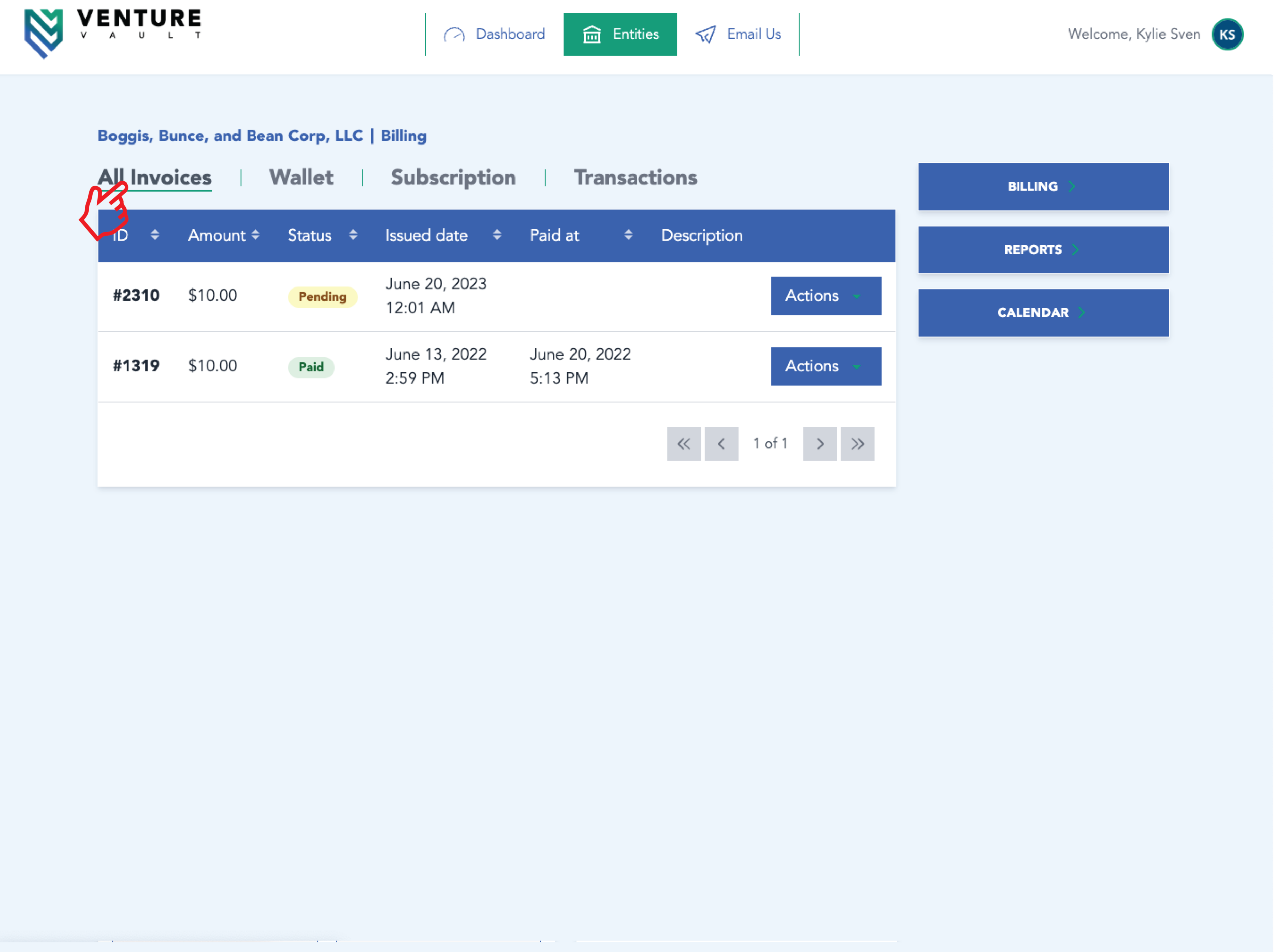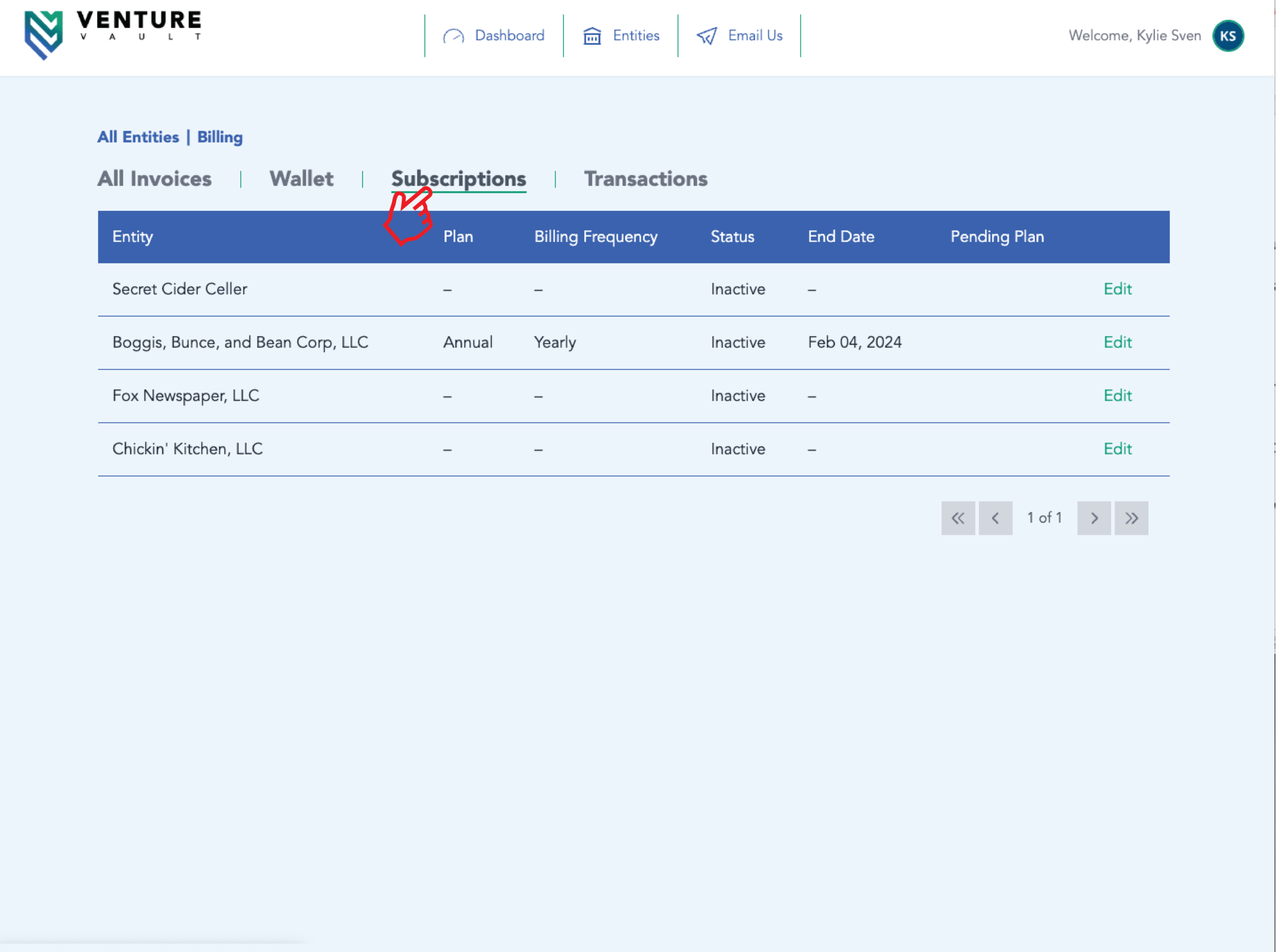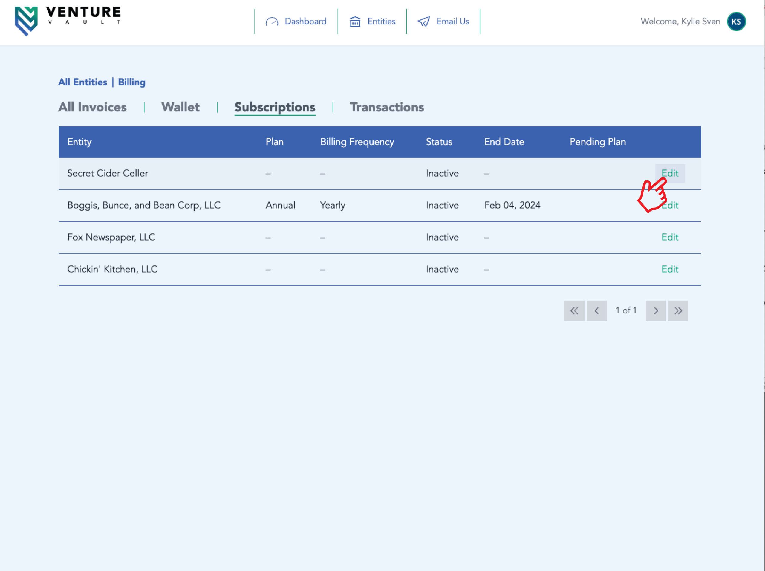 - Navigate to “Edit” beside the entity you’d like to make billing changes to.